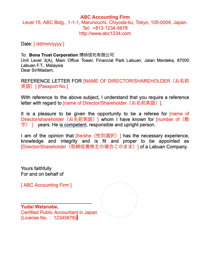 リファレンスレターとは「当該人物が信頼できる人物であることを客観的に証明するために用いられる専門家からの推薦状」のことです。ラブアン法人の株主、取締役になる方のリファレンスレターが必要になります。
