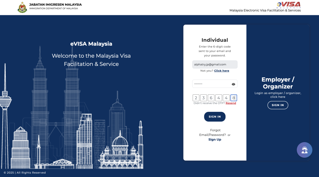 まずはマレーシアの移民局のホームページMyVisa – Portalにログインします。
