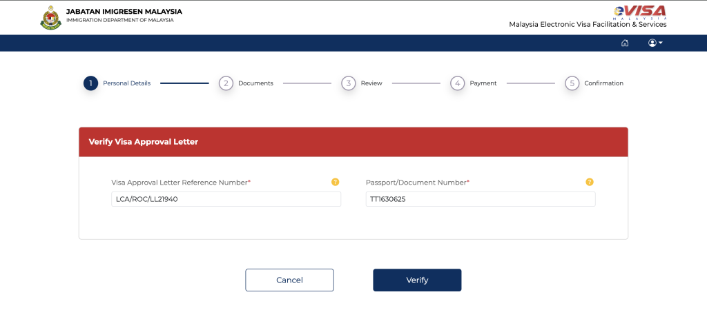 召喚状(Calling Letter)に記載の参照番号(No Rujukan Kami)とパスポート番号を入力して「Verify」をクリック。