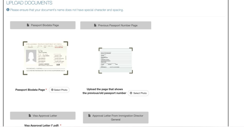次に、パスポートの画像や召喚状(Calling Letter)、戸籍謄本の英訳認証データ(扶養ビザ申請の場合)などを添付します。